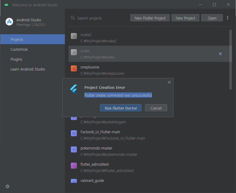 안드로이드 스튜디오에서 New Flutter Project로 프로젝트 생성시 다음과 같은 에러가 발생했습니다. Project Creation Error : flutter create command was unsuccessful