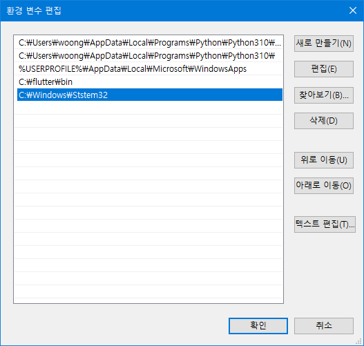그리고 새로 만들기 버튼을 클릭해 C:\Windows\Ststem32를 추가해줍니다. 그리고 다시 안드로이드스튜디오 실행 후 flutter Porject를 생성하면 정상적으로 생성되는 것을 확인할 수 있습니다.